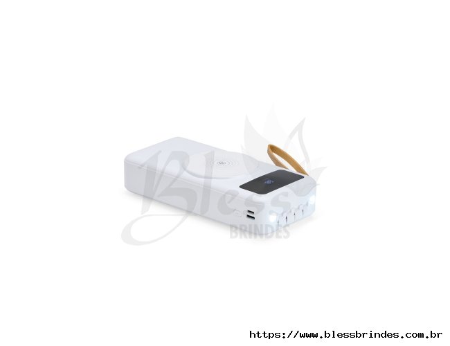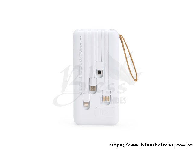 Power bank em plástico com capacidade de 20.000mAh, painel de LED que indica o percentual de bateria, alça para transporte e suporte lateral que permite apoiar aparelhos na horizontal. Possui quatro cabos acoplados, incluindo: USB-C, Micro USB, Lightning e Cabo USB, além de espaço reservado para carregamento por indução de aparelhos compatíveis. Dispõe ainda de conexões USB-C, Micro-USB e USB para recarga do próprio dispositivo.