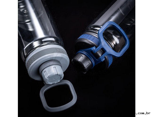 Descrição: Squeeze 700ml de plástico com alça. Tampa do squeeze e tampa de bico rosqueáveis, possui borracha inferior e detalhe emborrachado com relevo na tampa.