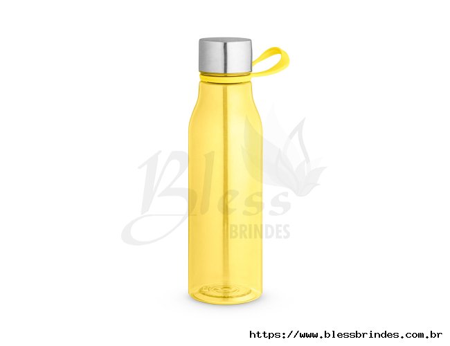 Squeeze em rPET 100% reciclado com alça de silicone para facilitar o transporte. Tampa em PP e aço inox com isolante em silicone. Capacidade até 590 mL. Caixa branca 94651 vendida opcionalmente. Certificação EU Food Grade. ø66 x 230 mm