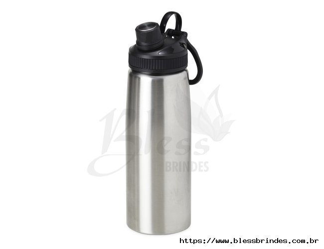 Squeeze inox 900ml com tampa plástica, bocal com tampa protetora e alça para transporte.