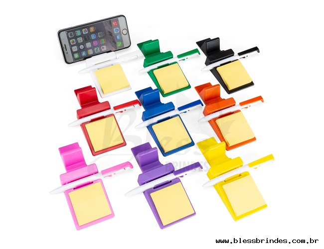 Descrição: Suporte plástico para celular com caneta plástica e bloquinho de rascunho. Suporte colorido com encaixe para caneta e celular, acompanha bloquinho amarelo com aproximadamente 50 folhas e caneta plástica branca com detalhes coloridos(acompanha na mesma cor do suporte), aciona por clique e para destravar basta apertar a parte inferior do clip.