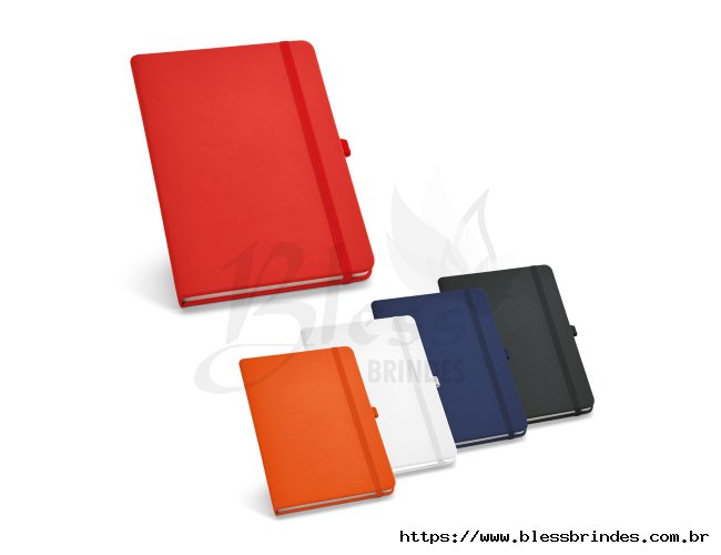 Caderno A5 em c. sintético, capa dura e 80 folhas não pautadas. Contém elásticos com capacidade para suportar esferográf