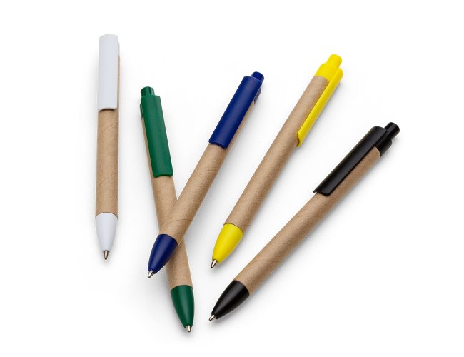 Descrição: Caneta ecológica de papelão com detalhes coloridos. Clip e ponteira plástica, possui relevo na ponteira. Aciona por clique.