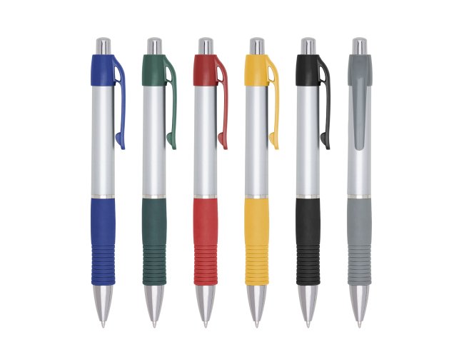 Descrição: Caneta plástica inteira prata com detalhes em colorido. Clip de metal, possui anel colorido e parte inferior emborrachada com relevo. Aciona por clique.