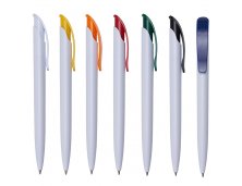 Descrição: Caneta plástica branca com detalhes coloridos. Clip plástico colorido e acionador prata, possui detalhe embor