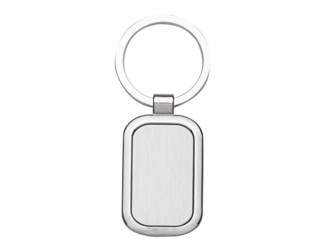 Chaveiro de metal retangular com bordas arredondadas, possui chapa frontal em metal e verso liso.