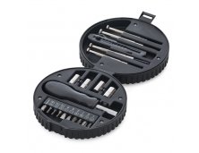 Kit ferramenta 24 peças em estojo de couro sintético. Possui: 5 extensores bocais(6MM, 7MM, 8MM, 9MM e 10MM), 3 tamanhos de chave Allen, trena de 1 metro(sem trava), 1 chave Philips, 1 chave Fenda, conjunto 10 pontas(4 chaves phillips, 2 chaves fenda, 3 chaves torx e um adaptador), chave auxiliar, chave que alonga ferramenta e alicate. Estojo de couro sintético com zíper e parte interna revestida de espuma.