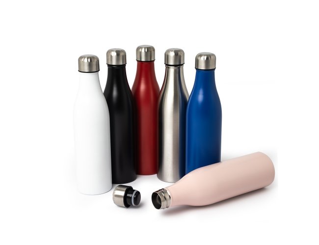 Garrafa inox com capacidade de 750ml. Contém tampa rosqueável com alça para transporte.