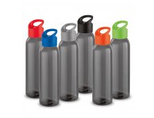 Garrafa plástica 1,1 litros com base de silicone anti-impacto (removível). Tampa com alça para transporte e tampa de proteção para o bocal.